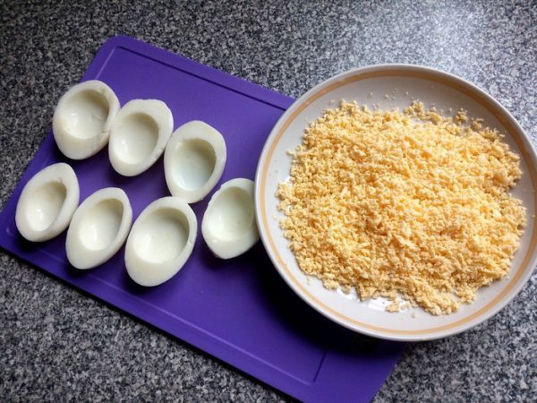Яйца отвариваем, разрезаем пополам, вынимаем желтки и натираем их на мелкой терке.
