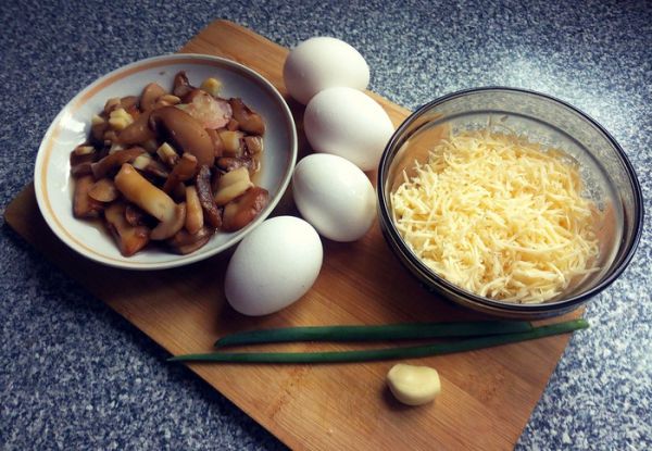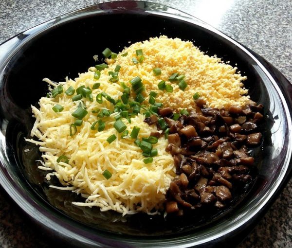Сыр, грибы, желтки, лук, чеснок заправляем майонезом и хорошенько перемешиваем.