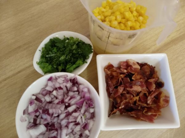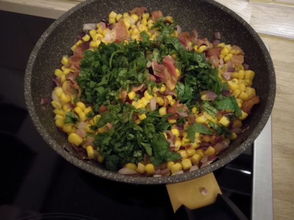 В сотейнике нагреваем небольшое количество растительного масла, обжариваем лук, буквально несколько минут. Добавляем бекон, кукурузу. Жарим 2-3 минуты. Добавляем кинзу, соль и перец, перемешиваем и снимаем с огня. Накрываем крышкой или перекладываем в миску и держим в тепле.
