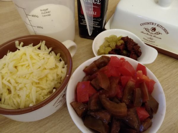 Чеддер трем на терке. Маринованный перец чили, чипотле нарезаем кубиками. Из помидора вынимаем мякоть и семена (у вас должно получится 85 грамм обработанных помидор) и нарезаем кубиками.