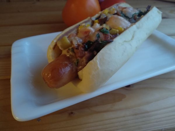 Сытный, вкусный хот-дог с островатым сырным соусом и сладкой кукурузой.