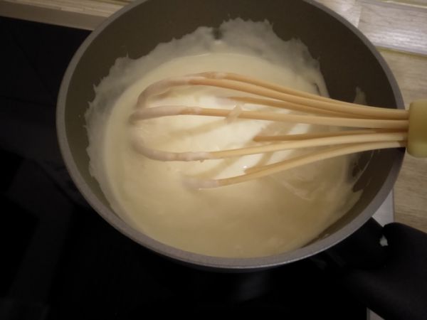 В сотейнике растапливаем сливочное масло, добавляем муку, хорошо размешиваем и жарим 1-2 минуты. Вливаем молоко, постоянно помешивая венчиком, чтобы не образовывалось комков. Варим на медленном огне до легкого загустения 5-6 минут. Порциями добавляем тертый чеддер, каждую следующую порция добавляем только тогда, когда предыдущая расплавилась.