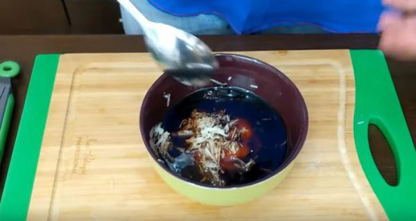 Тем временем сделаем ленивый соус BBQ. Для этого смешаем кетчуп, соевый соус, бальзамический уксус и чеснок. Готово.