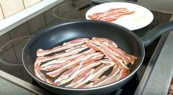 Пока лук стекает, пожарим бекон. Его нужно жарить на среднем огне, чтоб получить хрустящую текстуру.