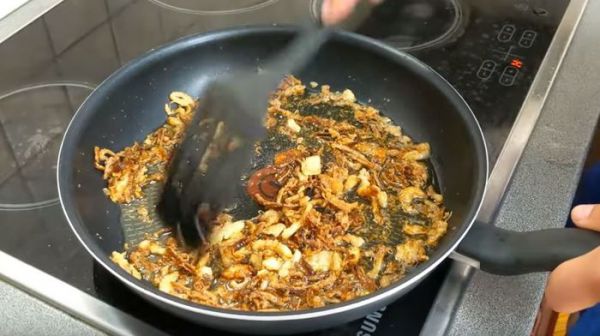 Лук стек? Ну тогда отжимаем с него всю лишнюю влагу и обваливаем в муке. Стряхиваем через сито лишнюю мука и жарим его в большом количестве масла на среднем огне до золотистой корочки.