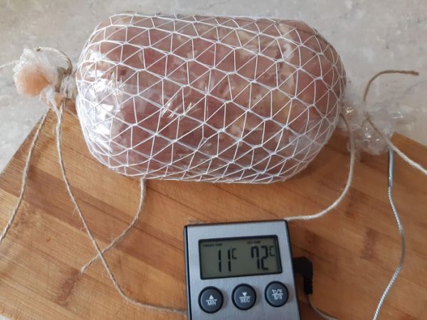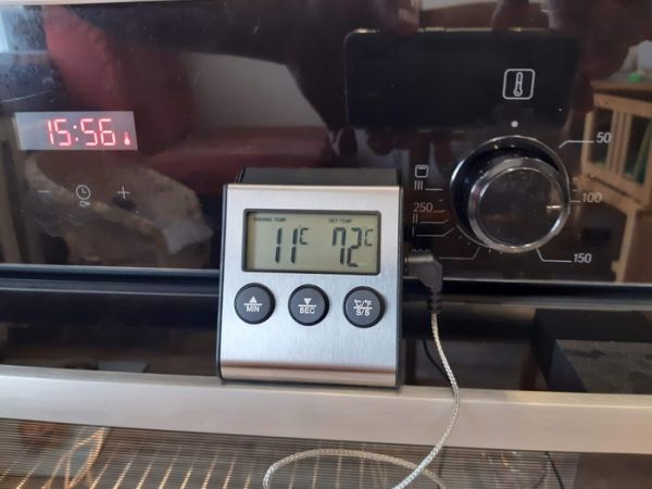 Довел температуру внутри до 75 градусов, этого получилось достичь часа за 3,5 с момента включения духовки (думаю можно было значительно раньше прекращать, но несколько перестраховался - был опыт встречи с сальмонеллами ранее в общепите).