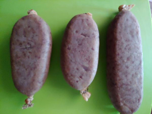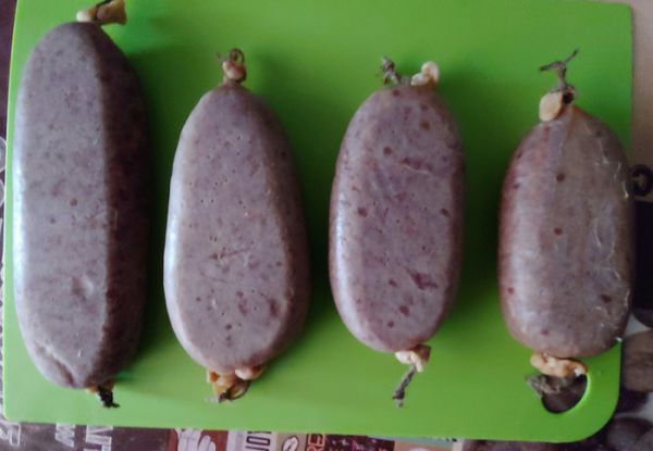 Получились четыре небольших батончика, которые уехали подсохнуть в холодильник на ночь. В результате стали видны «воздушные мешки», оставшиеся от набивки (на фото они светлее остальной части):