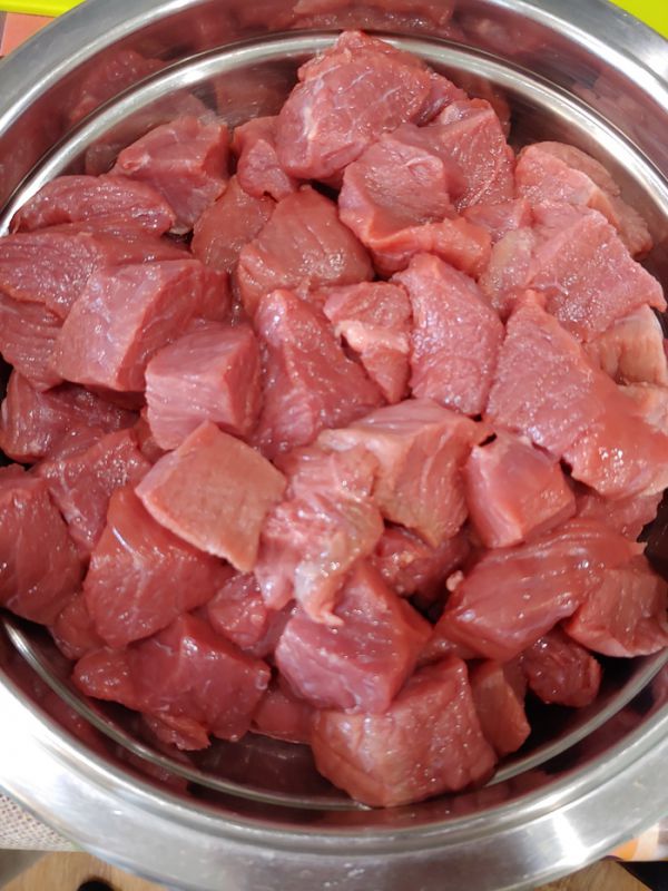Мясо я нарезал кубиками такими, что бы удобно было потом пропускать через мясорубку: