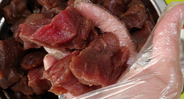Раствор я вмешал в мясо, имея ввиду, что излишний фанатизм при вымешивании здесь, в отличии от других колбас, скорее вреден.