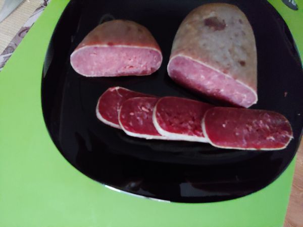 По прошествии недели, когда все кусочки мяса стали одного цвета, когда все запахи пропитали собой мясо - наступило время превратить мясо в подобие колбасы.