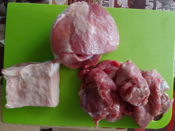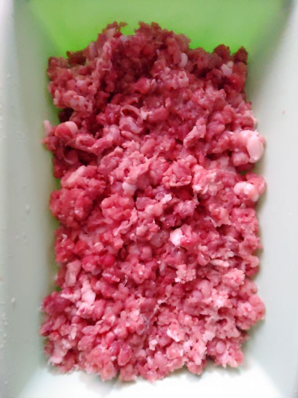 Для начала я взял 500 грамм телятины (у меня обрезь), 330 грамм свиной лопатки и всего 150 грамм свиного сала и пропустил все это через крупную решетку мясорубки (16 мм) и получил такой, совсем уж нежирный фарш.