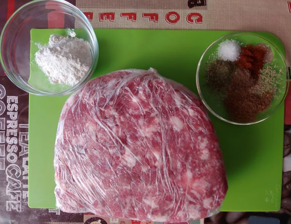 Затем фарш я переложил в пакет и отправил просаливаться в холодильник на ночь. Утром благодаря аскорбинке и ограниченному доступу воздуха фарш остался красиво-розовым, а значит я все сделал правильно и самое время подготовить специи.
