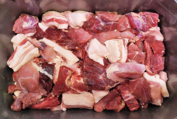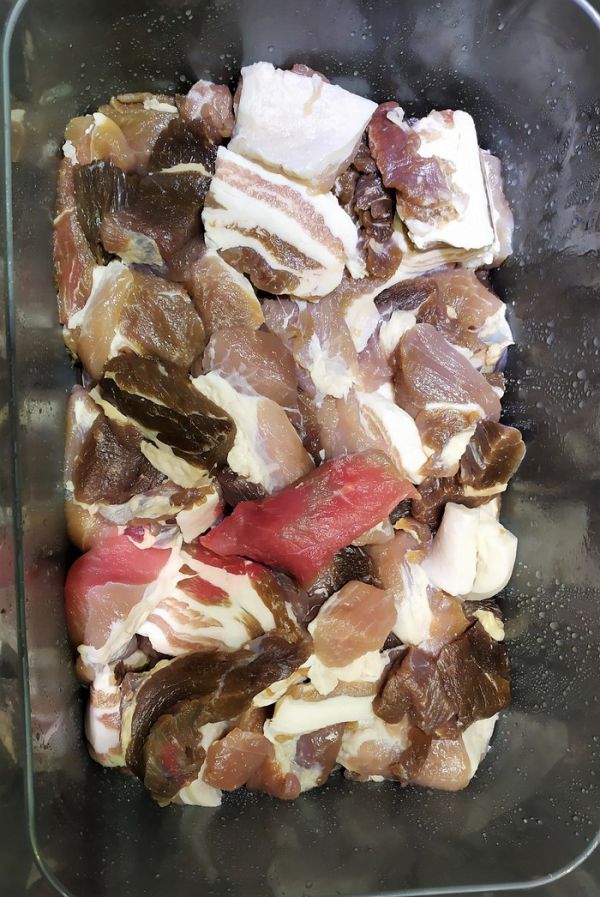 Мясо нарезал на кусочки, перемешал с нитриткой и сахаром, поставил в холодильник просаливаться на неделю.