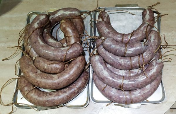 Фарш поделил на две части. В одну добавил 100 гр коньяка( Захотелось сделать и коньячную). И набил говяжьи чрева, получается вот так (со шпагатом посредине- коньячная)