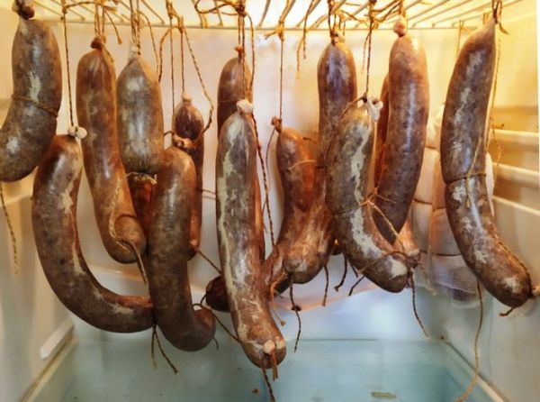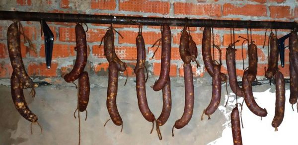 А затем в прохладный подвал на 4 недели, температура 16-18 градусов.Колбаса на фото другая.