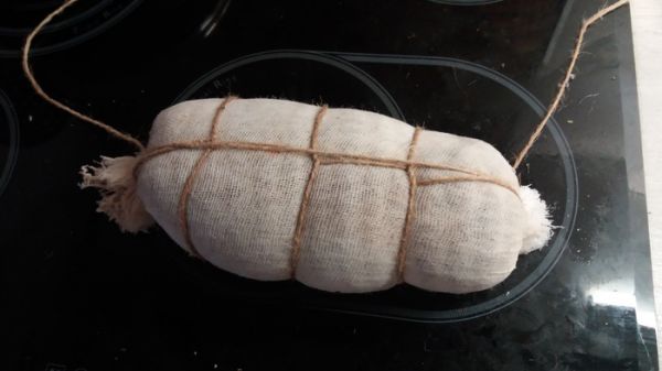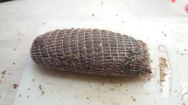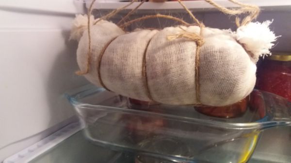 Мясо упаковал в формовочную сетку (для удобства сетку рекомендую надеть на банку (я использовал емкость в которой мариновал мясо), а потом стянуть сетку на мясо), завернул в марлю, перевязал шпагатом и подвесил в холодильник.