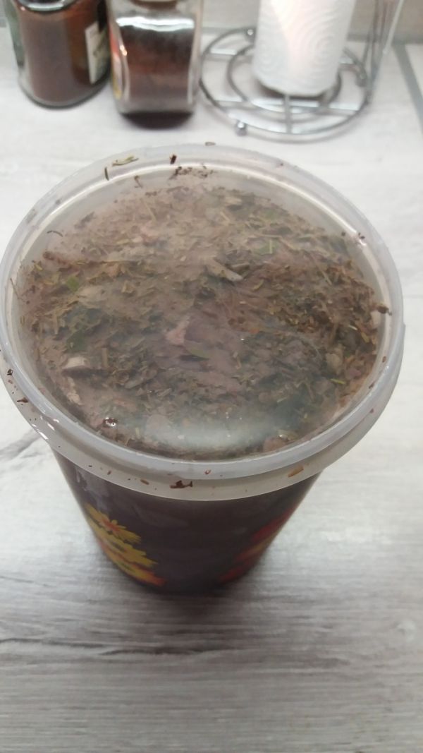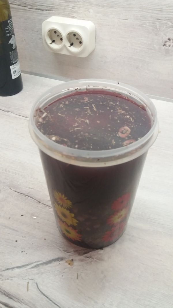 Далее все это дело поместил в емкость и залил вином. Сверху слой подсолнечного масла (создать пленку чтобы мясо и вино не контактировали с воздухом (кислородом)). Использовал пластиковую вертикальную емкость с крышкой (удобно хранить в холодильнике). Оставил мясо мариноваться на 2 недели в холодильнике.