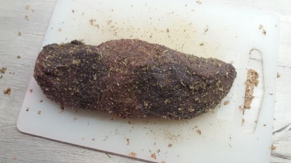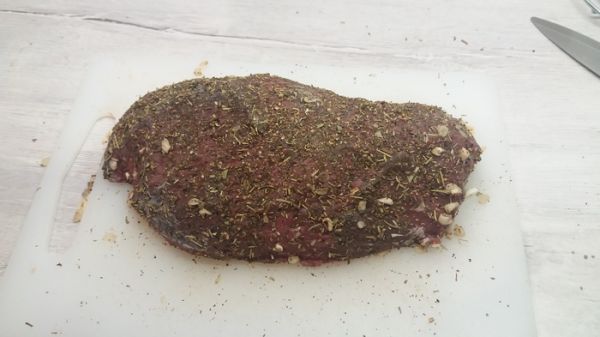 Мясо промыл, очистил от пленок. Обвалял в травах и специях (черный молотый перец, семена кориандра, сушеный базилик, петрушка, розмарин (побольше), орегано, гвоздика), добавил чеснок и присолил обычной крупной солью (1 чайная ложка).