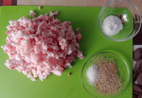 Назавтра я порезал 350 грамм шпика кубиками со стороной примерно миллиметра четыре, взвесил ещё 10 грамм поваренной соли, 3 грамма сахара и 2 грамма свежемолотого белого перца и 0.5 грамма мускатного ореха.