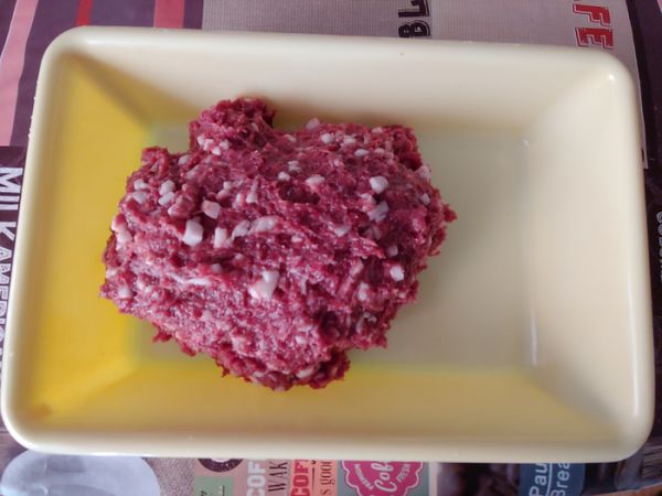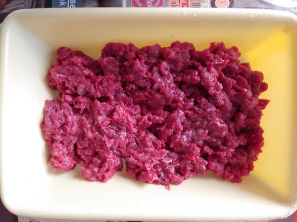 После освобождения от крупных плёнок, жил и других нелицеприятных вещей весы показали, что мяса осталось ни много ни мало, а целых 1.1 килограмма. Мясо я пропустил через крупную решетку мясорубки, добавил в него 18 грамм 0.6% нитритной посолочной смеси и 15 грамм поваренной соли и отправил на сутки в холодильник.