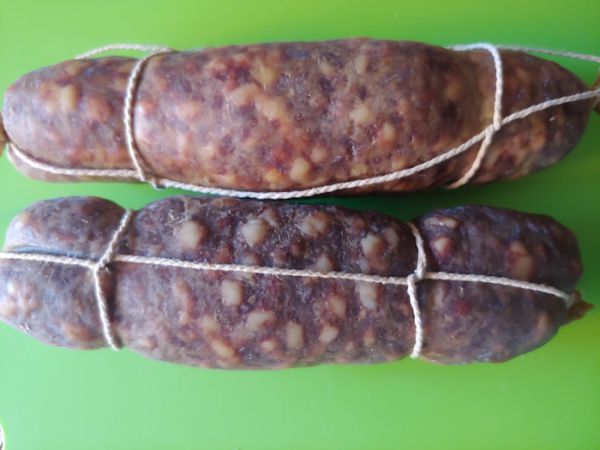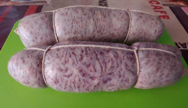 Фарш я набил в предварительно замоченную свиную гузенку - получились два неказистых батончика: