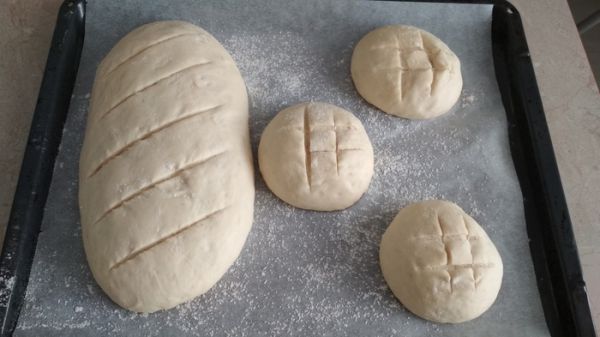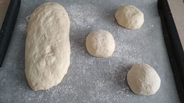 Достаем тесто из миски и на припорошенном мукой столе делим на порции из которых формируем буханки, батоны, булочки, багеты и проч. Можно использовать формы для выпечки, но я люблю в таком виде. По домашнему или по деревенски ))