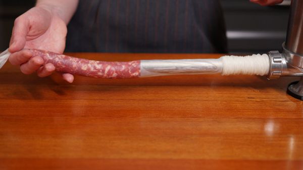 Затем начинила фаршем коллагеновую оболочку при помощи специального шприца.