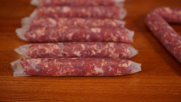 Готовила колбаски свино-говяжьи. На одну партию ушел 1 кг мяса.