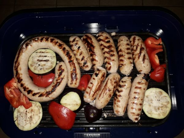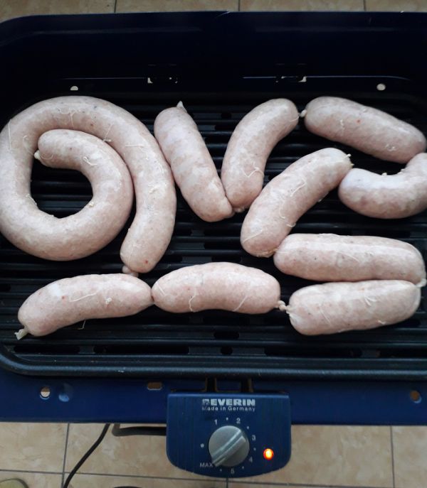 Пы.Сы. Когда готовила на гриле, сначала обжарила колбаски до полуготовности и только потом разрезала по отдельности, так концы не раскручиваются и фарш остается в колбаске)