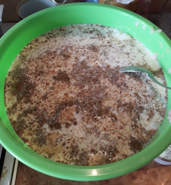 Засыпаем соль, сахар, специи ( у меня была приправа к мясу и курице), заливаем молоком и запускаем в это месиво руку и тщательно и с любовью перемешиваем))))