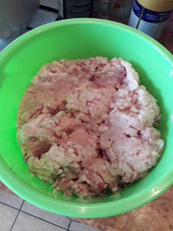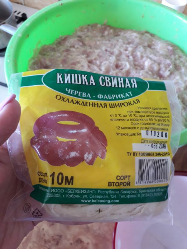 На следующий день, воодушевленные предстоящей дегустацией, берем кишки, предварительно промыв их от соли, мясорубку, насадку для колбасы и начинаем пихать)))