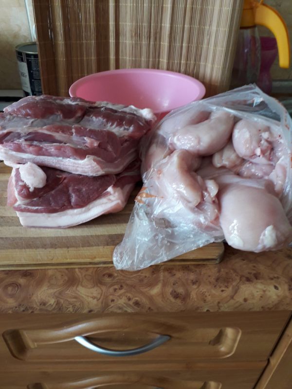 Увидев на рынке, шмат желтого сала под названием щековина, я заменила её на грудинку, и салко, и мяско, и колбаса не такая жирная будет!