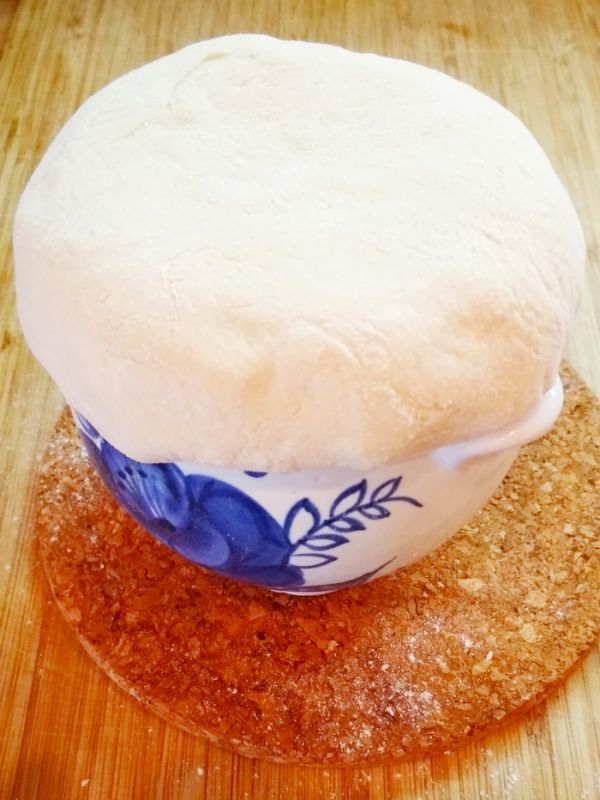 Через час раскатываем (растягиваем руками) из теста два кружка толщиной сантиметр-полтора.
