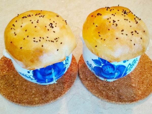 Через двадцать минут наше блюдо готово. Я для красоты смазал крышки смесью яичного белка и молока и посыпал черным кунжутом.
