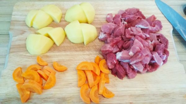Пока тесто расстаивается в теплом месте (духовка +30 градусов), подготовим горшочки. Нарежем небольшими кубиками мясо и чуть более крупно овощи (овощи быстрее развариваются, чтобы не получить кашу).
