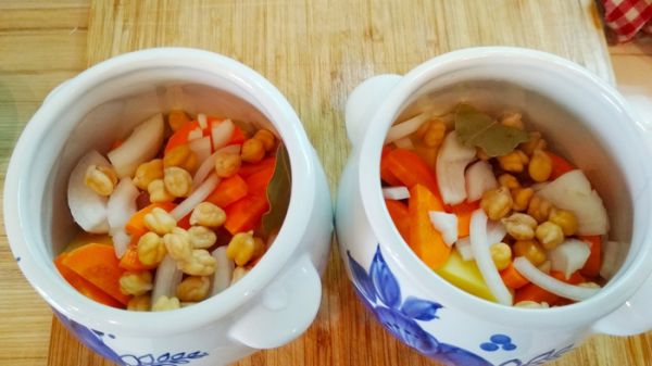В горшочки уложить слоями мясо, картофель, морковь, нут. Добавить лавровый лист и лук. Количество жидкости и продуктов кладете на свой вкус. Мне хотелось создать нечто, вроде густого супчика.