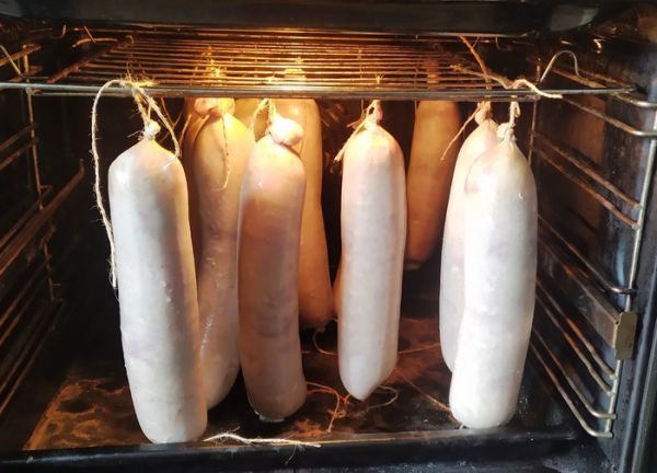 После набивки получились такие колбаски. Подвесил в духовку на обжарку.