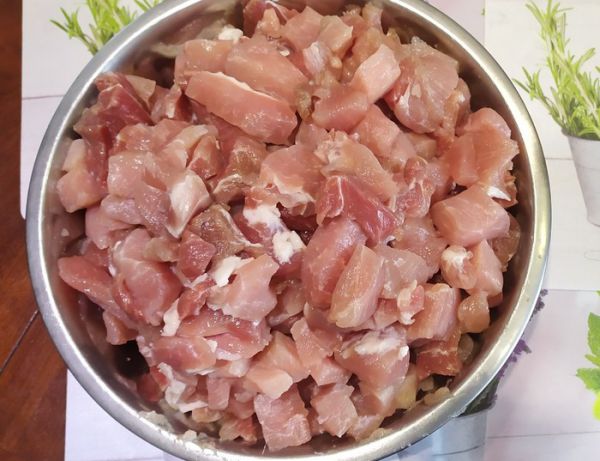 Постные куски нарезал на мелкие, размером от 1х1 до 3х3 сантиметров. Жирную свинину прокрутил на мясорубке.