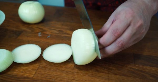 Лук чистим и срезаем с краев так, чтобы осталась «шайба» толщиной около 3-4 сантиметров.