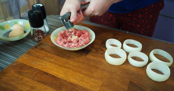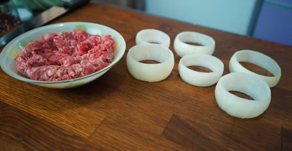 Сверху закрываем фаршем и уплотняем, чтобы луковое кольцо не соскальзывало.