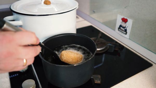 Разогреваем растительное масло до 180 С (масло должно полностью покрывать луковое кольцо), помещаем колечко и жарим 7 минут на среднем огне.