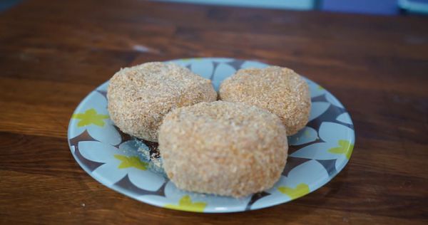 Обваляем в муке, затем в яйце (предварительно размешанном) и в панировке. Затем снова в яйце и в панировке, так сок от фарша не протечет во время готовки.