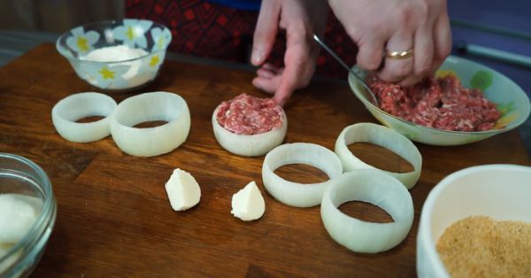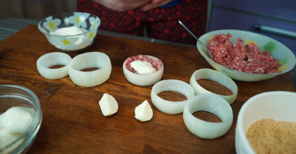 Берем луковое кольцо, заполняем его фаршем и делаем углубление в центре куда помещаем кусочек сыра.