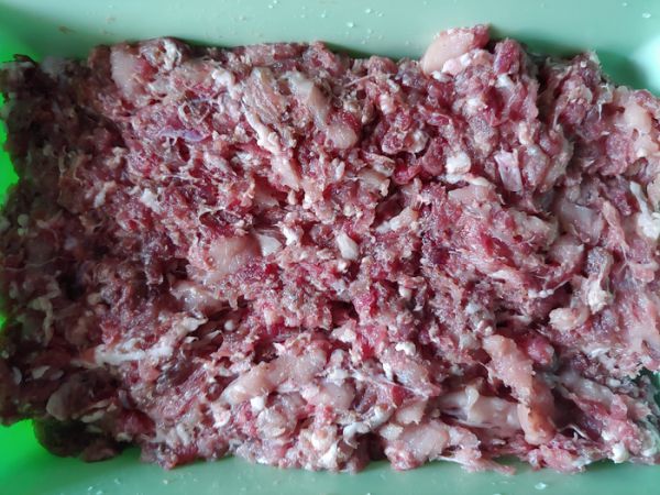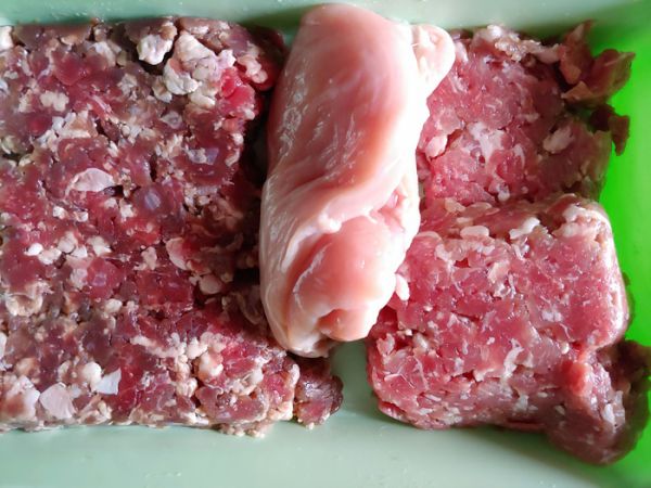 Филе я нарубил ножом, посолил восемью граммами поваренной соли, разведённой небольшим количеством воды. Смешал все три вида мяса, добавив к полученному фаршу по полтора грамма чёрного и душистого перцев и три грамма сахара.