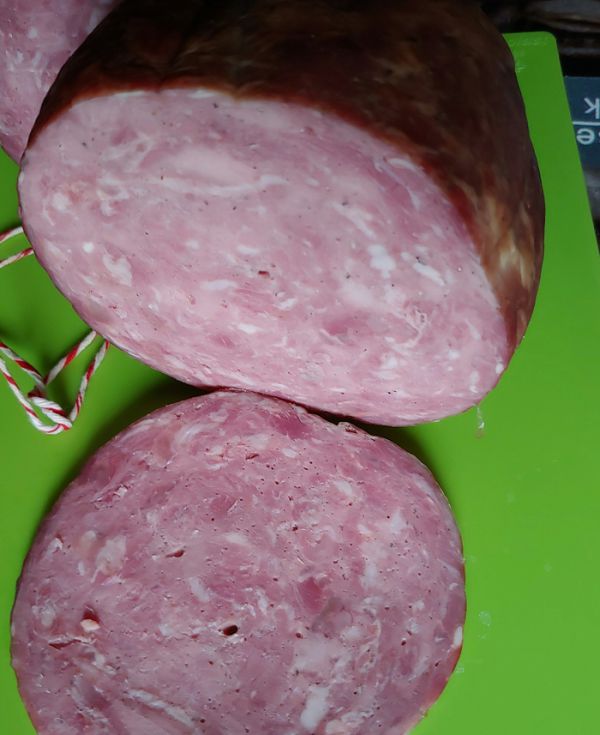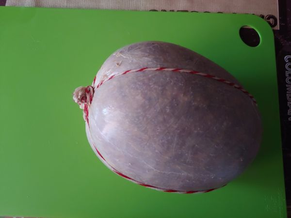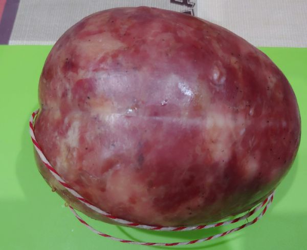 А для этого колобка мне понадобилось 600 грамм говяжьей мякоти и 500 грамм свиной лопатки. Свинину и говядину я пропустил через крупную решетку мясорубки (16x30 мм) и засолил на ночь 0.6% нитритной посолочной смесью в сочетании с обычной солью. На говядину у меня ушло 10 грамм посолочной смеси и 2 грамма поваренной соли, а на свинину - 4 грамма нитритки и 6 грамм обычной соли. Солил я, разводя смесь солей в небольшом количестве холодной воды (примерно 20-30 мл на каждый вид мяса). Кроме того я, помня, что мясу нужна «одежда», замочил в холодной воде свиной пузырь.