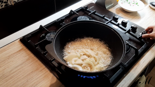 Наливаем масло в казан и ставим греться. Как только масло прогреется обжариваем в нем лук, нарезанный полукольцами. Жарить лук надо до слегка золотистого цвета.