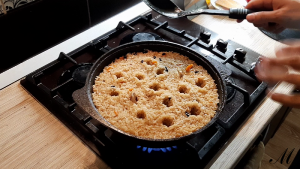 В плове вода ни к чему, и нам надо её выпарить. Для ускорения этого процесса можно сделать несколько ямок до самого дна по всей плоскости. Как только вода испарится (проверить это можно легкими постукиваниями по поверхности ложкой, звук должен быть глухой, без чвакиваний и шлепков), плиту убавляем на минимум, закрываем казан крышкой и оставляем томиться на 25-30 минут.