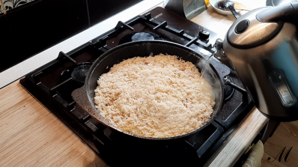 Выкладываем рис в заказ ровным слоем и заливаем опять кипятком, теперь так, что бы воды была на 2,5-3см выше уровнем, чем рис. Включаем плиту на максимум и ждем пока рис впитает воды столько, сколько ему необходимо.