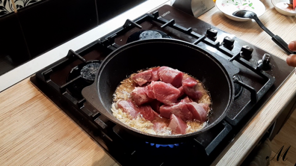 Как лук поджарился, отправляем к нему мясо. Мясо стоит нарезать достаточно крупными кусками, иначе к концу готовки (а это часа 3) у нас от него останутся только угольки. Мясо обжариваем до того момента, пока на нем на начнет образовываться зажаристая корочка.