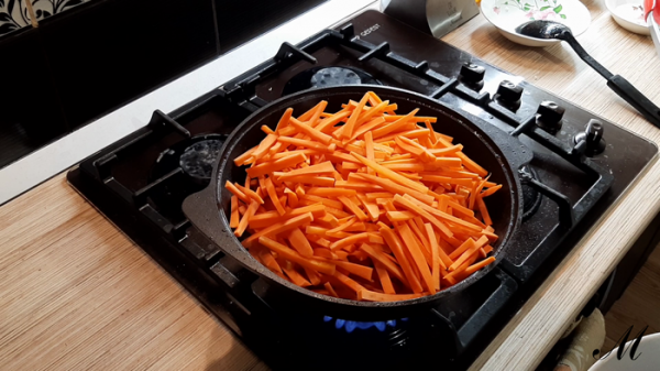 после этого добавляем в наш казан морковь. Морковь надо так же как и мясо нарезать достаточно крупно, иначе она превратиться в кисель. Я нарезаю морковь соломкой, так красивее в готовом блюде смотрится. Морковь высыпаем в казан, но не мешаем. Даём ей обязательно прогреться 3-5 минут, иначе мы резко охладим содержимое казана и ничего хорошего с этого не выйдет.